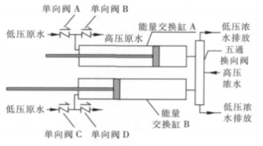 低壓原水從單向閥 A 或單向閥 C 進(jìn)入能量回收裝置,充滿能量交換缸 A 或 能量交換缸 B;高壓濃水從五通換向閥進(jìn)入能量回收裝置,當(dāng)五通換向閥使高 壓濃水與能量交換缸 A 連通時,高壓濃水將能量傳遞給低壓原水,實現(xiàn)能量交 換,高壓原水從單向閥 B 進(jìn)入反滲透膜壓力容器進(jìn)行脫鹽處理;待將能量交換 缸 A 中的原水全部加壓送至反滲透系統(tǒng)后,五通換向閥,將高壓濃水與能量交 換缸 B 連通,重復(fù)上述能量交換過程,同時能量交換缸 A 中低壓原水進(jìn)入,排 出低壓濃水。兩個能量交換缸交替進(jìn)行高壓濃水與低壓原水的能量交換,實現(xiàn) 將低壓原水連續(xù)增壓送至反滲透系統(tǒng)進(jìn)行脫鹽處理。