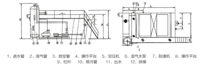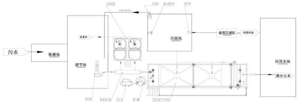 工作原理:在一定條件下,將大量空氣溶于水中,形成溶氣水,作為工作介質(zhì),通過釋放器驟然減壓快速釋放,產(chǎn)生大量微細(xì)氣泡粘附于經(jīng)過混凝反應(yīng)后廢水中的“礬花”上使絮體上浮,從而迅速地除去水中的污染物質(zhì)達(dá)到凈水的目的,詳見工藝流程圖。